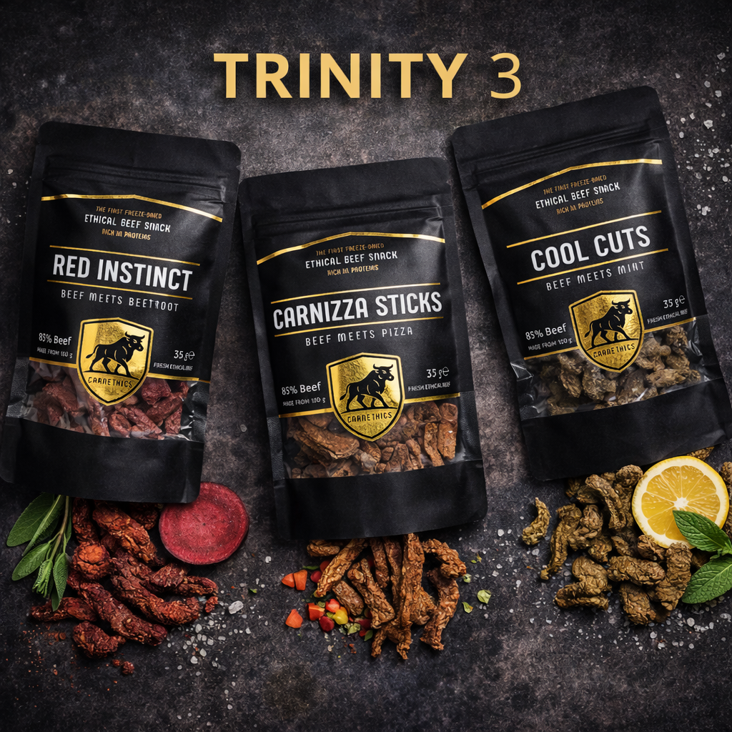 Das Trinity Bundle kombiniert drei ethische Premium-Beef-Snacks aus Südtiroler Rindfleisch in einem funktionalen Set.